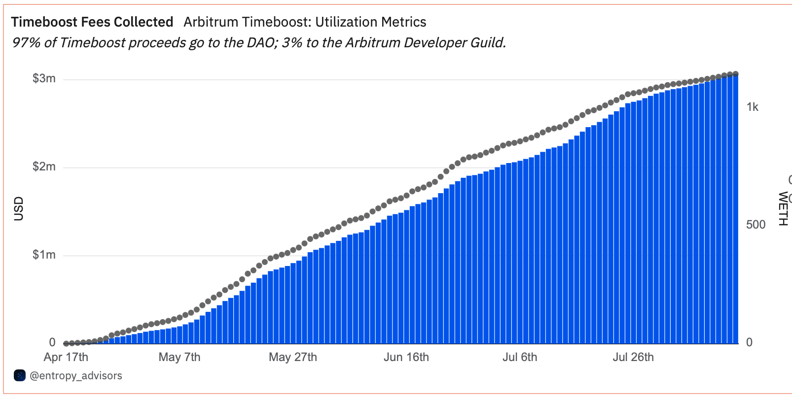 @Arbitrum@offchainlabs are these 3% currently being set aside yet? or no? @Entropy are the Timeboost fees shown here deducting these 3% already or not? from the chart description I assume not, but would love to get that clarified.