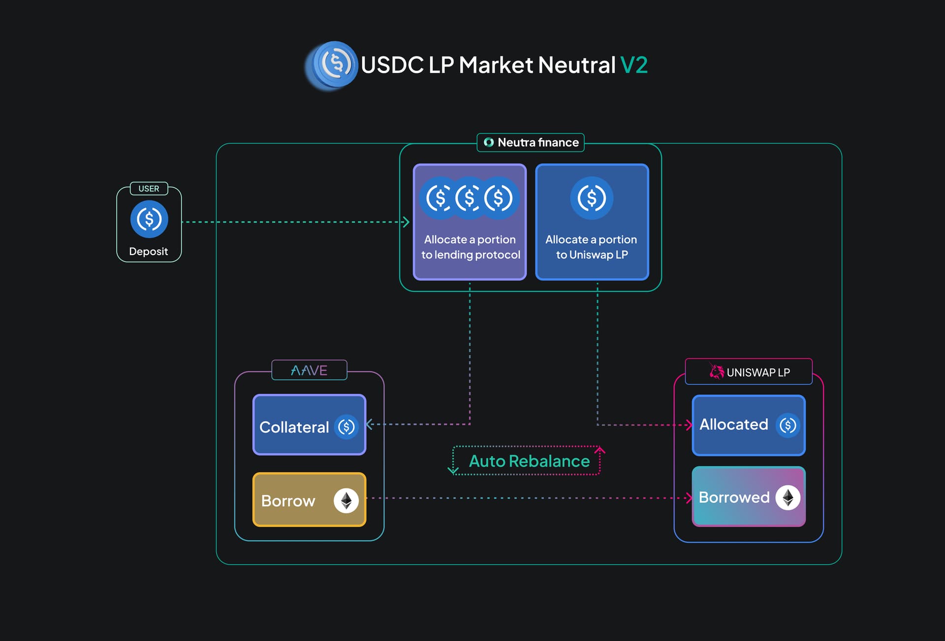 Moreover, Neutra Finance is in the process of introducing a new strategy called USDC LP Market Neutral. This strategy aims to exploit the efficiency of Uniswap V3’s concentrated liquidity feature, again with the goal of minimizing market exposure. It accomplishes this by shorting ETH on Aave and going long on ETH within the Uniswap V3 LP Pool, with automatic rebalancing triggered upon reaching predetermined thresholds (i.e., the ratio of ETH borrowed to ETH in the LP). Read details here