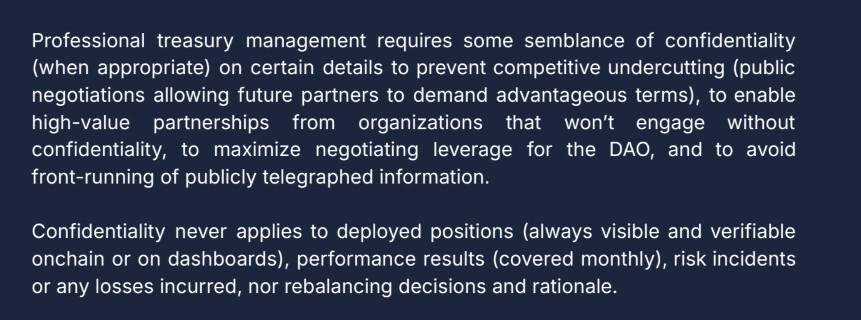 The default state of the ATMC, through its monthly and quarterly updates, is full transparency. That said certains elements of deployments (especially in strategic growth allocations) will remain confidential only when necessary, for greater DAO interests. This is outlined in section 7.5.2. of the IPS.